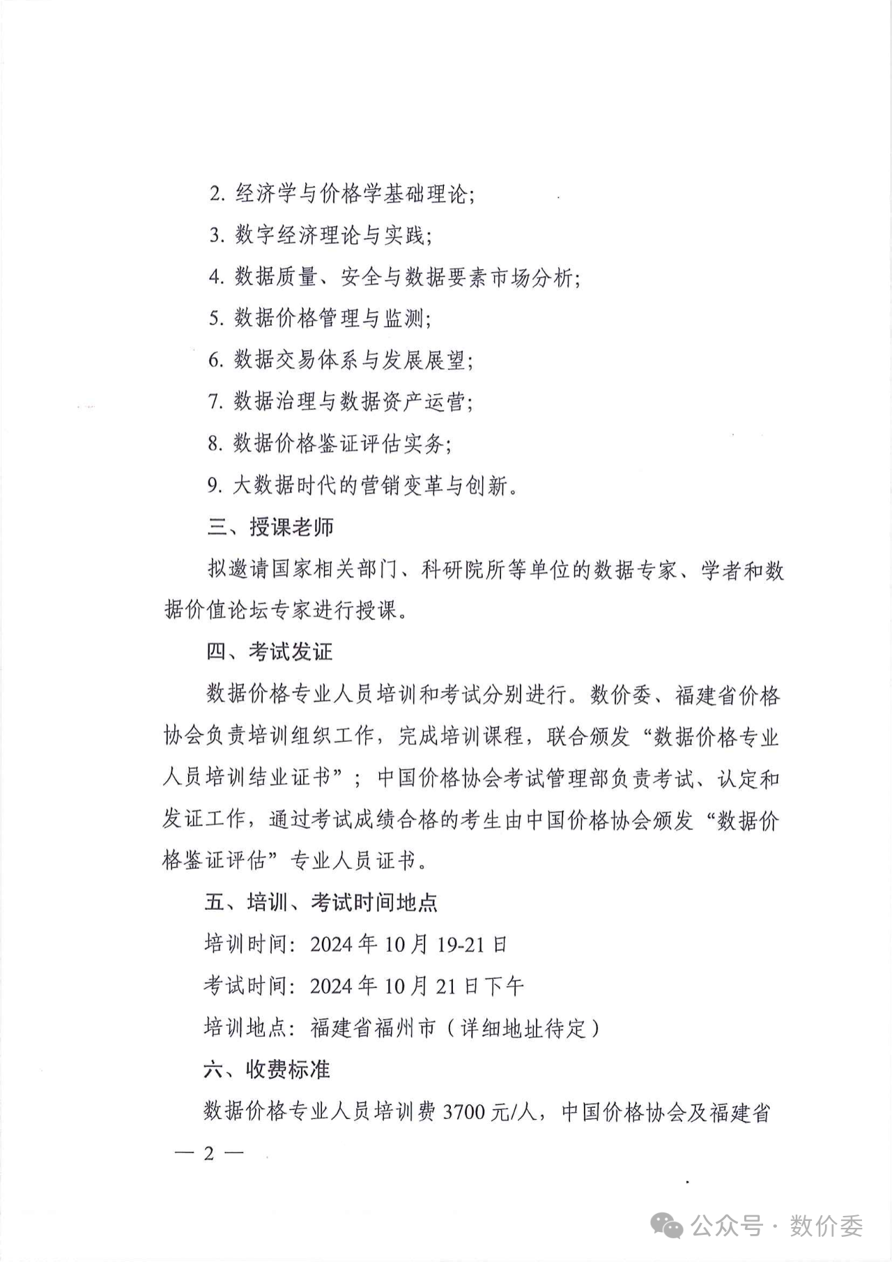 為滿足數據要素市場發展需求,提升數據價格專業人員的業務水平,培養從事數據管理和數據價格專業人才,更好地為數字經濟服務,中國價格協會數據價格專業委員會(以下簡稱“數價委”)聯合福建省價格協會擬定于2024年10月在福建省福州市舉辦第四期“數據價格專業人員培訓班”?,F將相關事項通知如下: